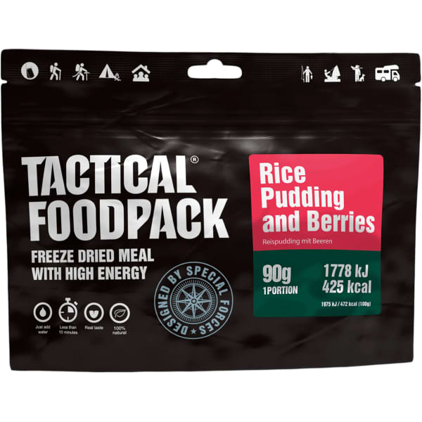 RICE PUDDING AND BERRIES 90G de Tactical Foodpack es una bolsa de comida liofilizada sin conservantes ni aditivos. Este alimento práctico es ideal para tus excursiones al aire libre. Con ingredientes naturales, este desayuno te dará toda la energía que necesitas para tus aventuras. Con una capacidad de 90 g, esta bolsa es resellable y tiene una conveniente línea de agua en el envase. Vierte el agua en la bolsita, espera 10 min y ya sólo queda probar.